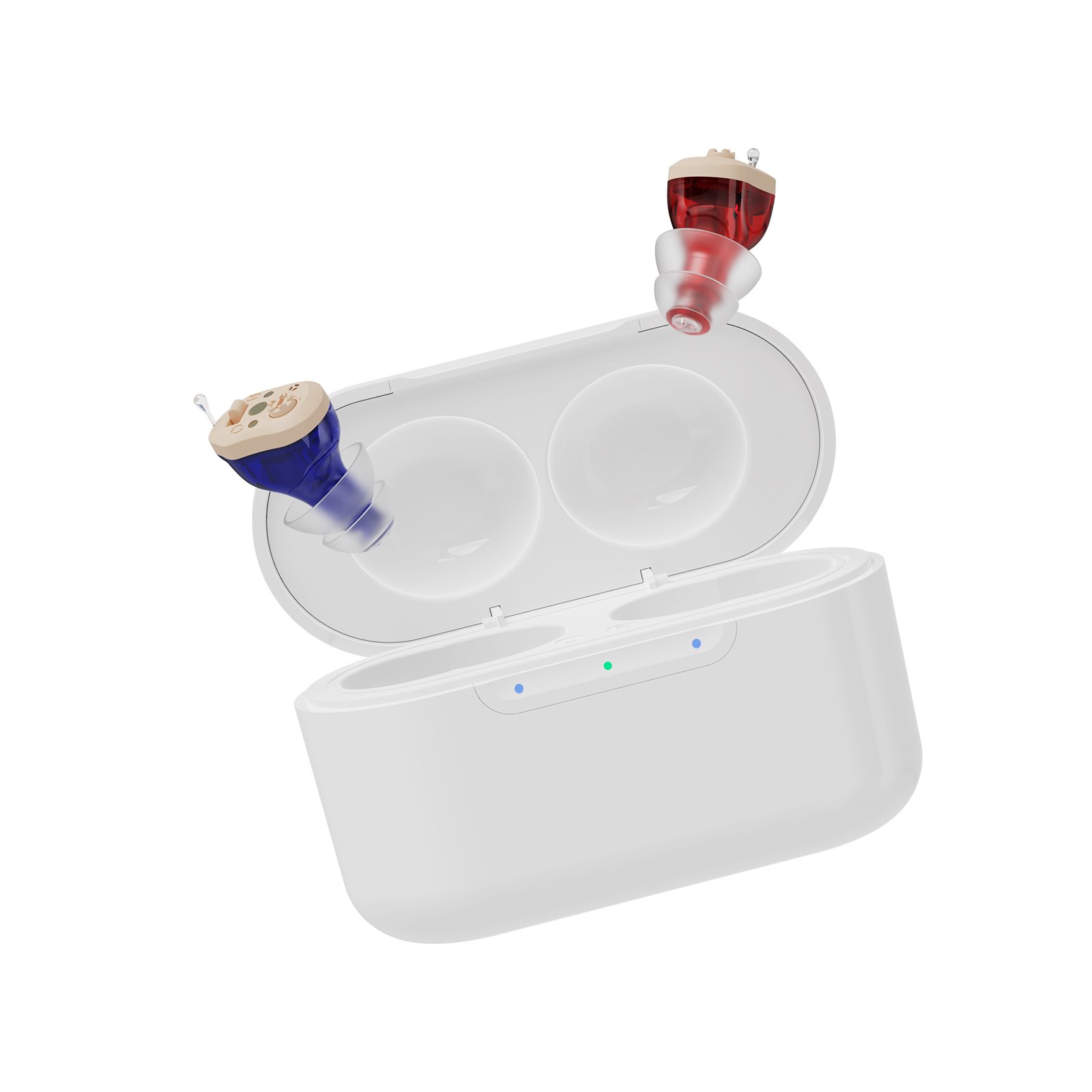 Disponível em duas versões: modelo com pilha A10, que dura até 3 semanas, ou modelo recarregável com estojo portátil que oferece até 140h de autonomia sem precisar de tomada.